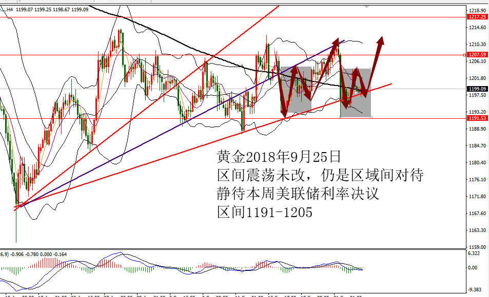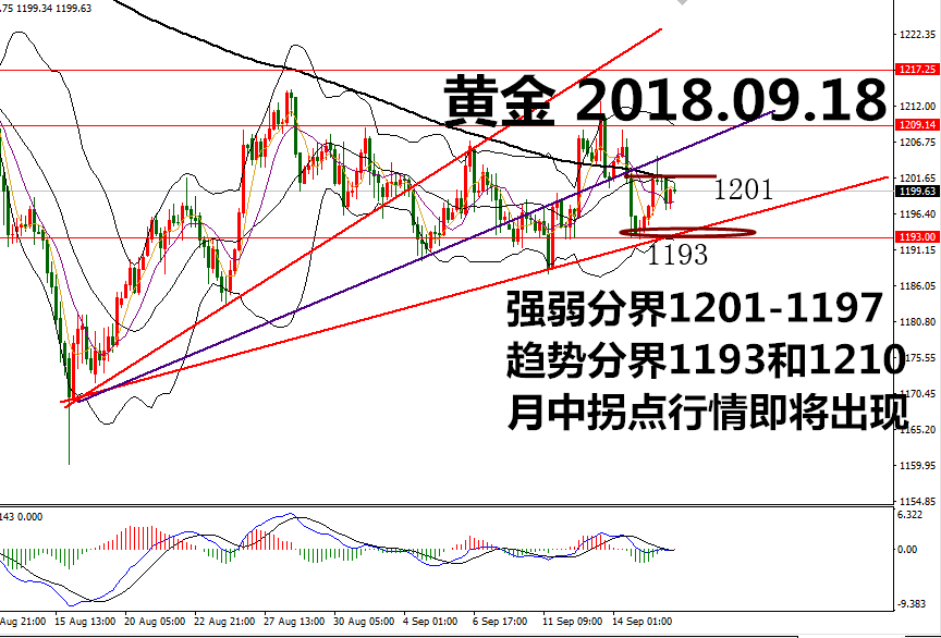 何小冰:黄金外汇震荡节奏,开盘高低点定强弱 09.18 黄金 周线压力均线分界1206-1209,趋势线分界压力1217,年线分界点1224,日线收口走平区间1188-1211,围绕生命线位置徘徊震荡,四小时上周难得突破生命线,可惜没有站稳,最终重回趋势线下方位置,形成区间震荡,放射形形态的区间,支撑位置1193与布林带下轨叠合,年线压力1201,趋势线压力1206,布林带上轨压力1209-1210. 9月27日美联储将公布9月货币政策会议纪要,而在此之前,也来到了月中的循环破位点,从2018年4月中旬至今,每个月的中下旬都是行情爆发走单边的最佳时间点,而过往都是向下破位的行情,以日线生命线