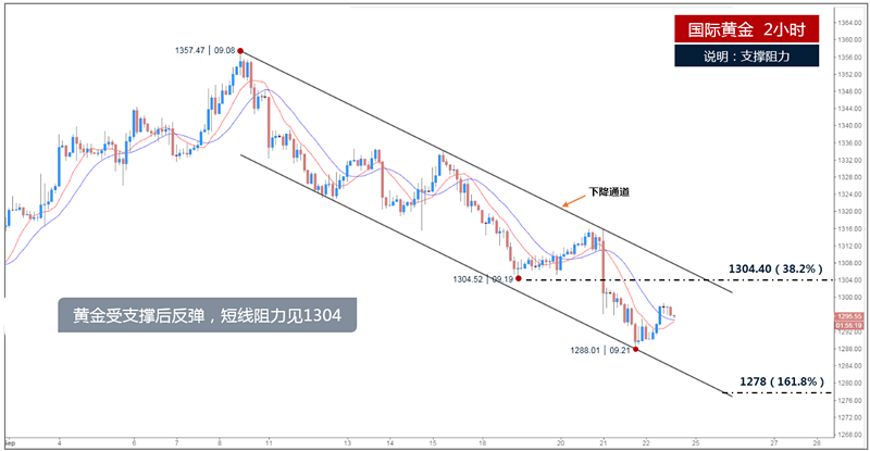 消息面解析: 国际黄金周四(9月21日)继续大幅下挫,美市盘中最低下探至1287.61美元/盎司,触及四周低点,对美元进一步走弱。周三美联储宣布维持利率决定不变,但暗示将在12月份进一步加息。黄金对美国利率上涨非常敏感,提高持有无息收入黄金的机会成本,同时提振对其定价的美元。日内公布的美国至9月16日当周初请失业金人