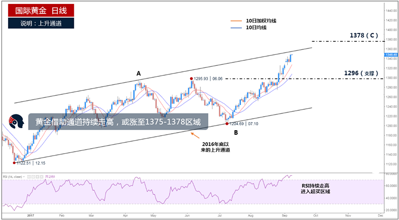 消息面解析: 进入9月,适逢多事之秋。9月4日-8日当周,由于朝鲜核爆和墨西哥地震先后来袭,黄金创逾一年新高1357.67美元,收报1346.59美元/盎司,周升幅达1.61%;周日(9月3日),①朝鲜进行了第六次核试验,引发黄金周一(9月4日)跳空高开,②兼之后来墨西哥发生逾8级地震,避险情绪再度高涨,③欧洲央行德拉基暗示正在考虑削