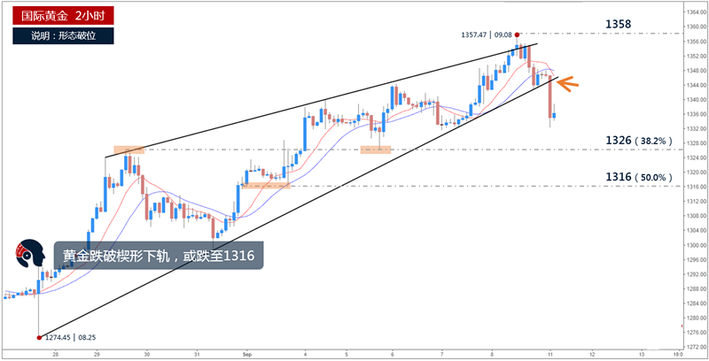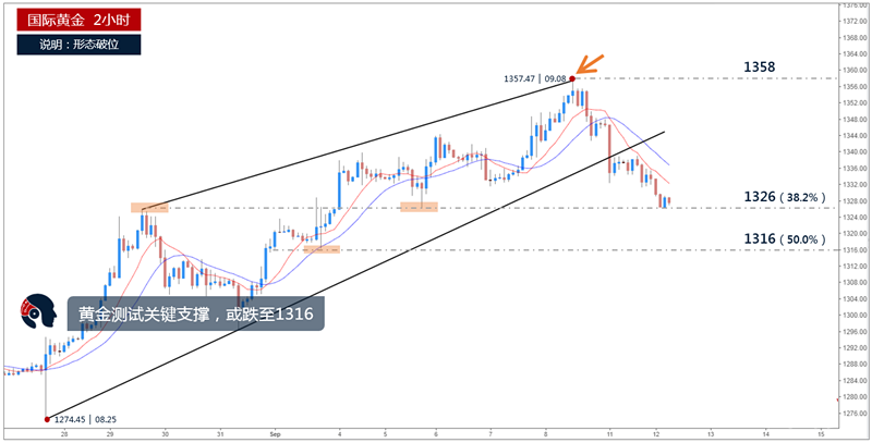 黄金走势分析: 果然没有出乎预料,周初因朝鲜未能如市场预期发射导弹,导致市场避险心理迅速降温,亚市开盘跳空低开十美金,最低触及1334美元一线,而在日内白盘持续的低位震荡下,价格未能回补技术面缺口,导致美盘价格延续下跌,跌破了1330一线支撑最终试探了1326一线关键支撑,日线继上周五高位十字阴线后再次收阴。从日