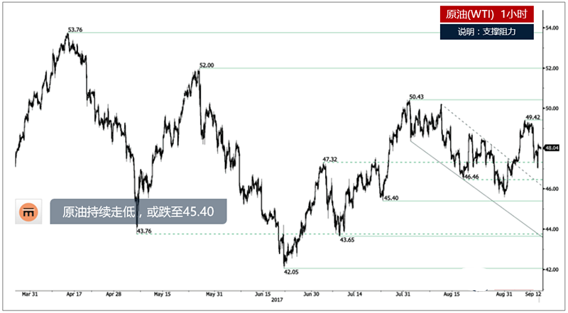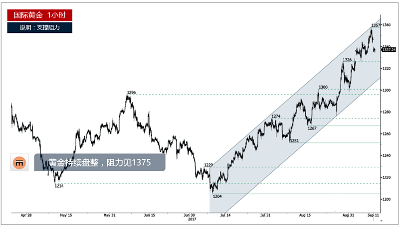 消息面解析: 由于朝事件和飓风艾尔玛的影响这两个事件都没有按市场预期成功地实现。短期内黄金会有一些调整,调整很大程度上依赖于美元和债券将如何走向。美元走强使得黄金对于其他货币的持有者来说更为昂贵,潜在地减少需求,而较高的债券收益率增加了持有无息资产黄金的机会成本。但朝的不确定性可能会持续下去。朝周一警