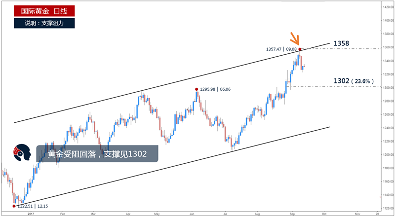 消息面解析: 黄金在周一(9月11日)因市场对朝鲜的担忧缓解,Irma飓风的冲击影响不及预期,提振了美元走强,周一跳空低开延续曾大幅下挫1.4%下,上交易日周二(9月12日)止跌回升收取了涨势,金价重新回到1330关口上方,美市盘中最高上探至1332.03美元/盎司,终收于1331.00美元/盎司。主要推力还是朝鲜对于特朗普声称联合国对己
