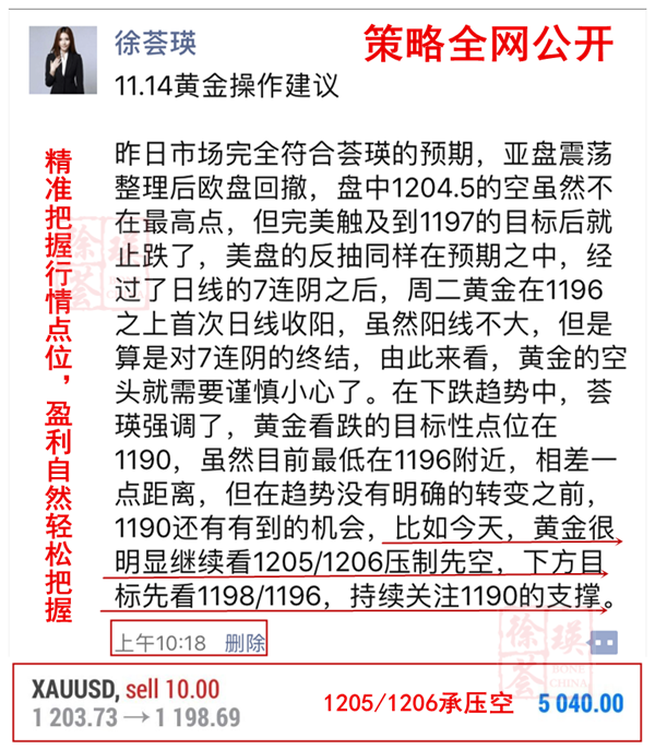 徐荟瑛:11.14黄金修正近尾声全新布局开启,精准思路助你轻松盈利 荟瑛还是习惯于总结每日的操作记录,只是为了给亏损的你一个方向。有客户经常问我,老师会翻仓吗?荟瑛想说的翻仓并没有你们想像的如此难,市场从来不缺乏赚钱的人,或许你现在正处于亏损,或者投资的路上并没有得到很大的收获。那么你确实要总结一下你的投资之路了,你是否采用的正确的投资方式!不管你的钱来自哪里,但是我知道这些钱都是你们辛辛苦苦挣钱的,又或者是一些亏损严重的客户由于投资也给家庭生活造成了巨大的压力,荟瑛每当听到这些的时候都特别难过,荟瑛理解你们的处境,也特别想帮助你们挽回损失,从这个市场得得到回报! 荟瑛周三的操作策略,全都是
