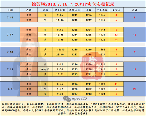 徐荟瑛:7.17黄金窄幅震荡盈利依旧,1248承压跟上空单赚钱妥妥的 但是最近总有一些朋友跟我说现在行情不好做,要嘛单边下跌,要嘛盘整一天,到底该以何种方式操作?而我想说行情瞬息万变,不要去猜测行情如何走,而是顺应它,抓住你能掌握的机会,大多数听到这话都觉得荟瑛说的是废话,但是荟瑛并不这么觉得。就像近期的行情,你还敢说没有机会吗?可是你抓住了么,抓住了又赚钱了么,赚钱了又赚了多少呢?我不得而知,但愿你们都是赚钱的。 可是在能赚钱的行情你没有赚钱,再不改亏损的时候你又在亏损,难道不该反思总结吗?操作不当就改正,频繁操作就减少次数,老师实力不济就换人,还是说继续加金,继续亏着,继续安慰自己:一切
