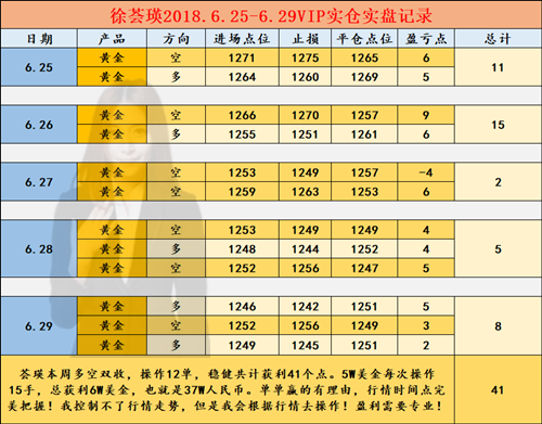 徐荟瑛:7.2黄金1240不破非农必将开启反击,空单及时出局避免被套 交易的过程其实是简单----复杂----简单的一个过程,开始的简单是因为我们的无知,对市场的了解太少,而中途的复杂和顾虑太多是因为我们开始了解市场了,但是不能很好的驾驭,所以会被市场的变化而冲昏头脑,感觉太复杂。但是最终我们追求和达到一定水平之后就会发现其实最有效的就是最简单的,最终能够深入了解市场了,同样又能够简单了,就能立胜这个市场了。希望大家能够明白投资即是一个学习的过程,也希望都能经历这个历程,因为这才是一个健康的发展方式。大家好,我是你们的老朋友徐荟瑛! 一周交易回顾,黄金本周获利40美金: 上周黄金震荡慢跌,周