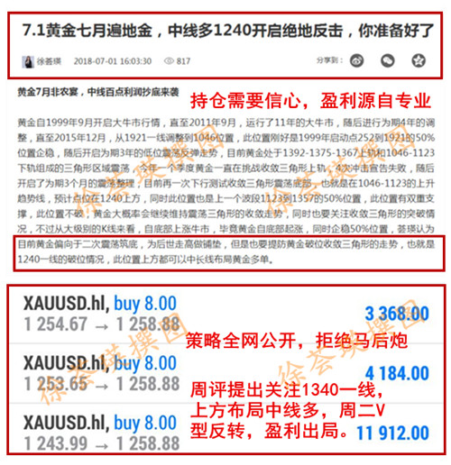 徐荟瑛:7.1黄金七月遍地金,中线多1240开启绝地反击,你准备好了? 本周行情已经结束,大家也可以暂时放下交易的事情,好好方松休息一下!不过又到了荟瑛工作的时候了,每周周末总是要抽时间来回顾总结这一周的行情走势,然后分析判断下周黄金的趋势预测;尽自己的能力帮助大家对下周的交易有一些思路。那么我们先看刚刚过去一周的行情走势。 是不是有很多人是看到抄底点进来看到吧!其实说真的,交易最重要的是思维的改变做到跟随行情的运行,不然很容易刚者易折,逆势抄底并不适合每个人,可能抄底对我而言很重要,但是对于大多数投资者而言稳定持久的盈利更重要,作为分析师必须为广大投资者去服务,在有效时间给出最有效的解决办