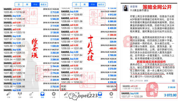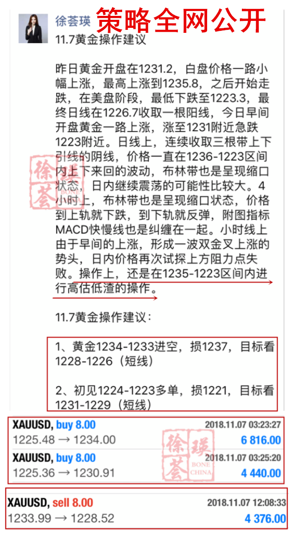 徐荟瑛:11.6本周大数据汇聚,黄金多空连胜全靠实力,日内独家解析 我知道大家在操作的过程中会经常遇到这样一个问题,老师喊了多单,行情下跌了一点,不敢进,想着在低点进吧,能多赚一点,结果行情一波拉升,再问老师还能进多吗?机会就是这样错过的,这就不是策略的问题了,很多朋友之所以造成亏损,无非就是,不带止损,频繁操作,重仓操作,逆势操作导致的,你们这样的情况我遇到过很多,完全没有任何操作计划的执行操作。你不亏谁亏? 荟瑛就问几点:你现在所在的平台风控部门有吗?如果你单子被套了之后,你那边老师会陪你熬夜到凌晨4点停盘吗?你们那边会教给你们技术方面的内容吗?会当你们像徒弟一样对待吗?会根据你们的资金