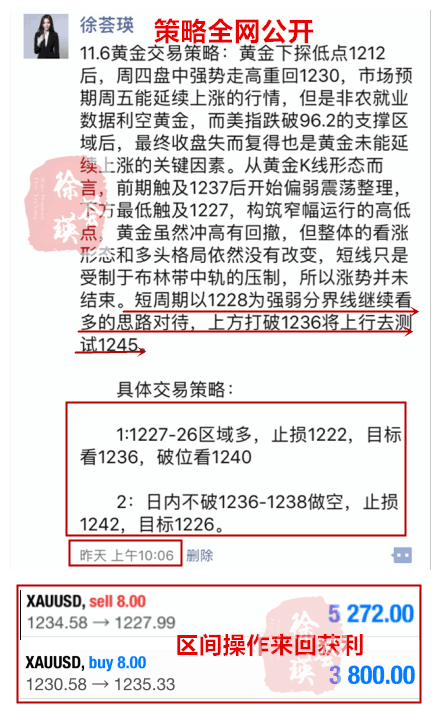 徐荟瑛:11.8利率决议再掀黄金市场风浪,盈利不为炫耀,只为你指明方向! 荟瑛还是习惯于总结每日的操作记录,只是为了给亏损的你一个方向。有客户经常问我,老师会翻仓吗?荟瑛想说的翻仓并没有你们想像的如此难,市场从来不缺乏赚钱的人,或许你现在正处于亏损,或者投资的路上并没有得到很大的收获。那么你确实要总结一下你的投资之路了,你是否采用的正确的投资方式!不管你的钱来自哪里,但是我知道这些钱都是你们辛辛苦苦挣钱的,又或者是一些亏损严重的客户由于投资也给家庭生活造成了巨大的压力,荟瑛每当听到这些的时候都特别难过,荟瑛理解你们的处境,也特别想帮助你们挽回损失,从这个市场得得到回报! 荟瑛周三的操作策略,