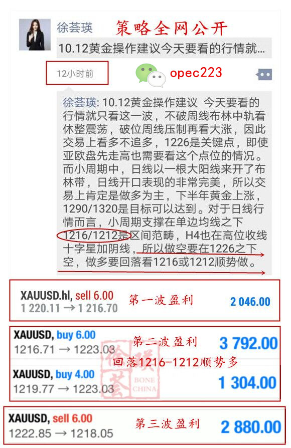 徐荟瑛:10.12黄金暴走35点疯狂收割,金九银十翻仓不是说说而已! 盈利不论资历,投资要有意义!我时常走在市场分析的前沿,时常叮嘱,投资黄金应当把风险控制放在第一位,却还是有人盲目投资,重蹈覆辙,以致于损失惨重。大家为了同一个目的,走同一条路,但结果总是截然不同。冷静,思考如何扭转现阶段的亏损;稳重,求稳不求多的做好每一单;谨慎,掌控风险止损常带。 ====温故而知新,黄金多头大暴走,今日盈利回顾 无需多说,晚间的暴涨相信让很多朋友捶胸顿足,晚间CPI和初请双数据利多,美元指数一度破位95关口,黄金暴涨,晚间最高点已达1226一线,行情自1191大涨测试1226一线,涨幅接近35美金,打破