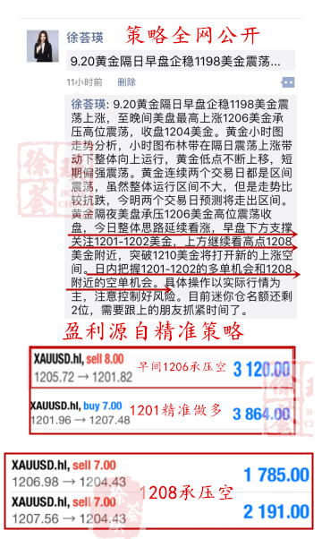 徐荟瑛:9.26黄金千二博弈,加息夜必将打破震荡格局,盈利照拿不误 前几日有一位朋友与荟瑛聊天,说是很感谢:我,因为他近期按照我文章的思路操作,赚了不少,近期做的超短线单子更多大赚一笔,这也是他投资过程中,唯一获利的一段时间,说实话荟瑛比较感动,感谢这么朋友的长期关注,市场上的分析师很多,他能关注到荟瑛是我们的缘分,荟瑛也很开心我的分析能帮到人,我也跟他聊了不少,然后他比较疑惑的是,我每天把策略公布到网上,还有人加入我们的团队吗? 荟瑛想说的是,策略是死的,这位朋友比较幸运,按照荟瑛的策略操作整体获利,但是由于客户我们是实时指导的,有任何问题都会第一时间解答,就这么说,荟瑛在文章中超短线多空