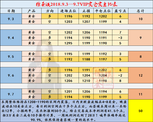 徐荟瑛:9.10加息接力非农多头能否翻身?黄金上周28W源自实力 非农周结束后,新的一周又开始了,不管是对前一周行情的回顾解析,还是对自身交易问题的总结,不管是盈利还是亏损,学会总结自己的问题,进而去改正进步,我们才能在投资道路上走的更远,走的更顺;上周整体维持在1208-1190的区间内震荡,日内亚欧盘波幅在4-8美金,晚盘波动在10美金左右,每日利润空间在十多个点左右,而荟瑛上周以来一共给出12单,小损两单,总共把握到50个点,除去交易成本净利润有41.5个点,按3万美金三成仓10手操作计算,一周纯利润达到了28万!喊单准确率高达90.9%,依然保持着荟瑛一贯的高水平。 面对市场上无数一