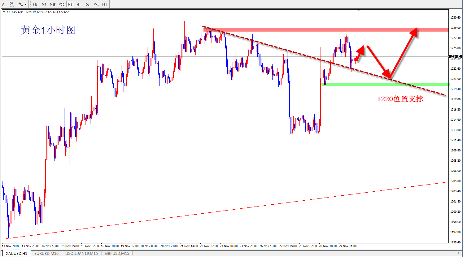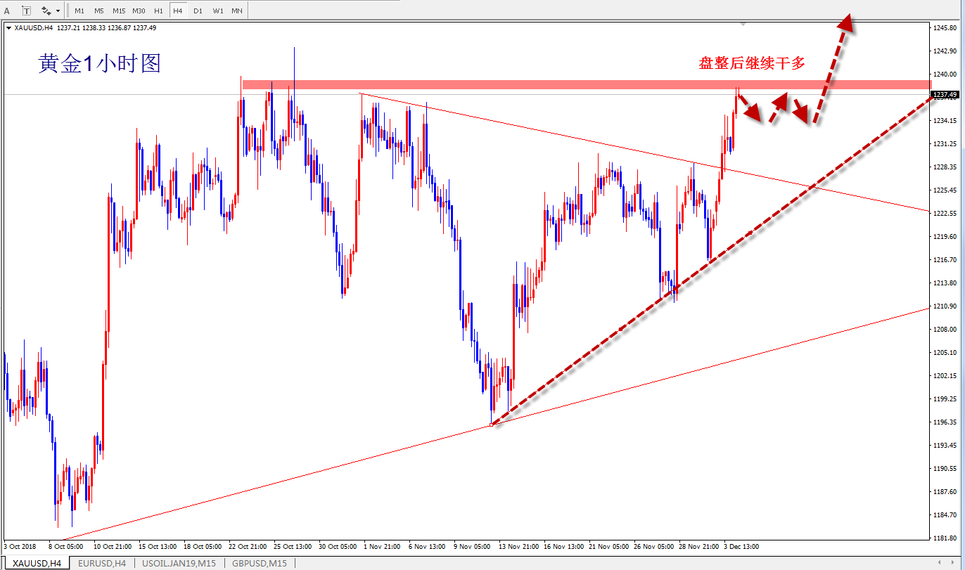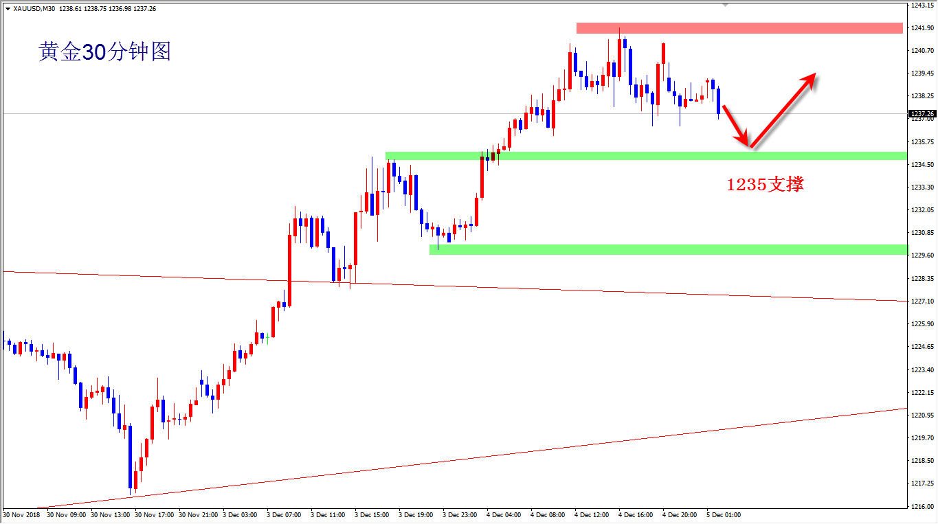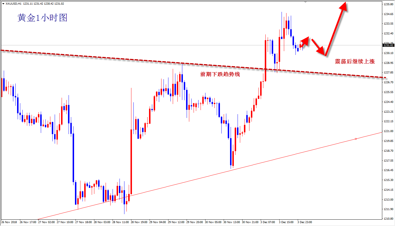 12/4周二, 黄金 回落1230直接多,保护1225,目标1235; 昨日黄金受到毛衣战缓和及美联储未来可能暂停加息的双重影响,一路上涨, 王杨也分别在早盘1223位置,欧盘1227位置,美盘1228位置提示多单进场,最终黄金上涨至1234一线!大获全胜!原油更是在52.6位置做多至53.8位置,虽然53.4位置在52.9损掉一单,但是美盘52.8位置的多单再次出手进场,最终到位53.3离场!大获全胜,收获满满! 更多现价策略,请点击这里! 黄金当前依然处于震荡向上走势,昨日突破1228位置后回踩确认后继续震荡向上,今日回落后继续看涨,支撑位置1228上先看涨!上方目标看1236压力位置能