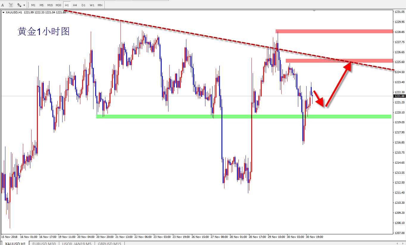 12/3周一,原油52.6现价多,保护52.1,目标53.1-53.6,现报52.6; 黄金 周五下跌至 1216线后快速拉回,美联储票委讲话认为明年将会降低加息次数,维持中性利率,受此消息影响,黄金周五V型反转,再次站稳1220上方!今日黄金依托重要支撑区域下沿1219看多!第一目标位置是1225-1227区域!如果此区域突破将会冲击1243位置! 本月 20号的美联储利率决议依然会按预期加息,所以在加息之前黄金大概率维持震荡走势!如果12月份的会议纪要,显示明年加息次数降低或者本次加息周期结束,黄金将有望迎来大级别周期的上涨!后续对于中线布局在加息之后可以展开! 历次美联储加