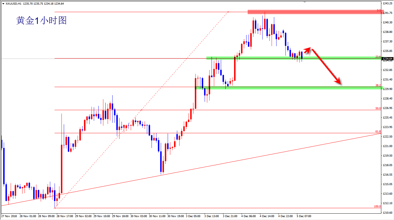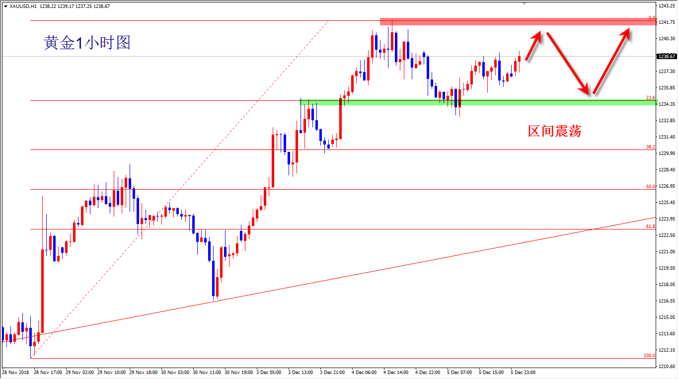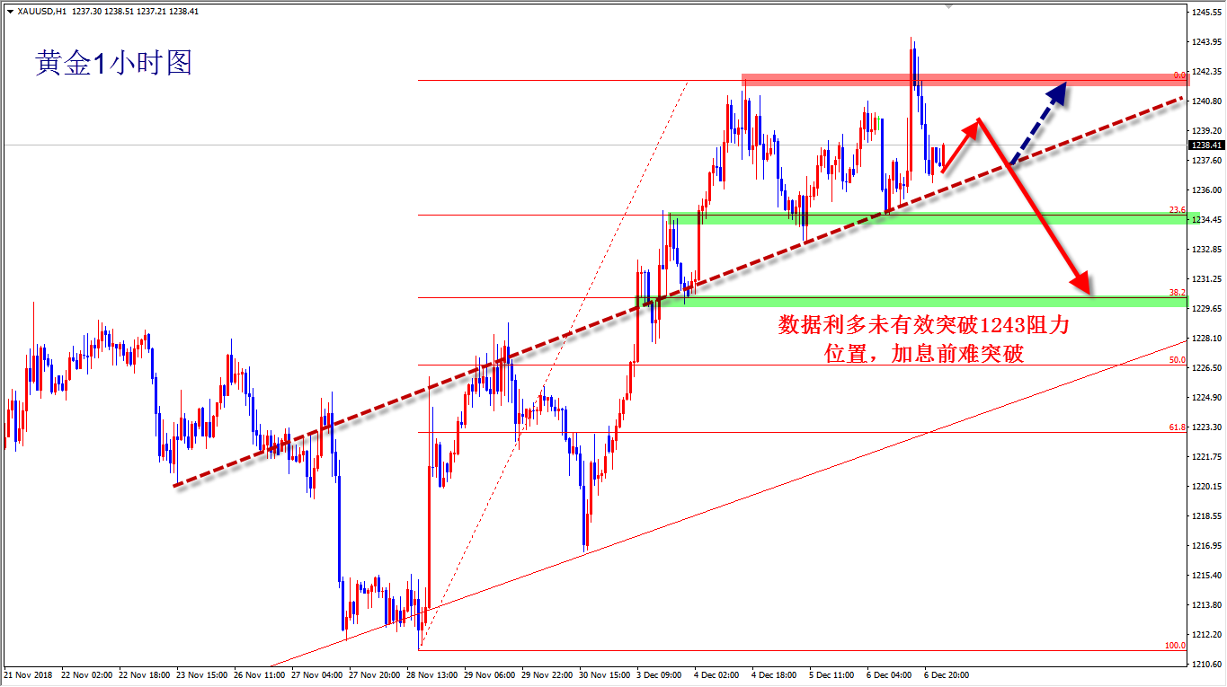 12/7周五, 黄金 1238空,保护1244,目标1233-1230;现报1238.2; 黄金昨日数据利多未有效突破 1243压力位置,转头向下,上方区间压力明显,利率决议前黄金难突破,要突破还需震荡回调蓄力!前期回调到0.236(1234)位置,后展开反弹,如果今日上涨还不能有效突破1243,将会继续回调0.382(1230)位置!早盘看黄金反弹力度,高位1240附近看跌! 思路决定出路,格局决定结局!交易市场风云变幻,充满了无数的陷阱和诱惑,我们不做死多也不做死空,只做顺应市场的滑头!当前黄金很明显进入震荡格局,不必对多头抱有太高的幻想,高空低多震荡操作!如果前期王杨一路多你没