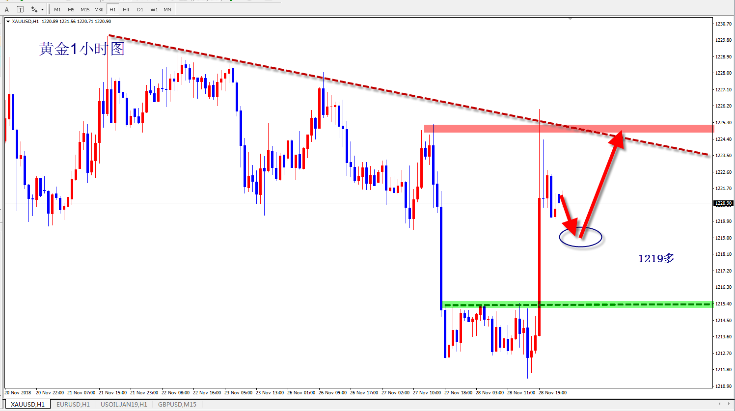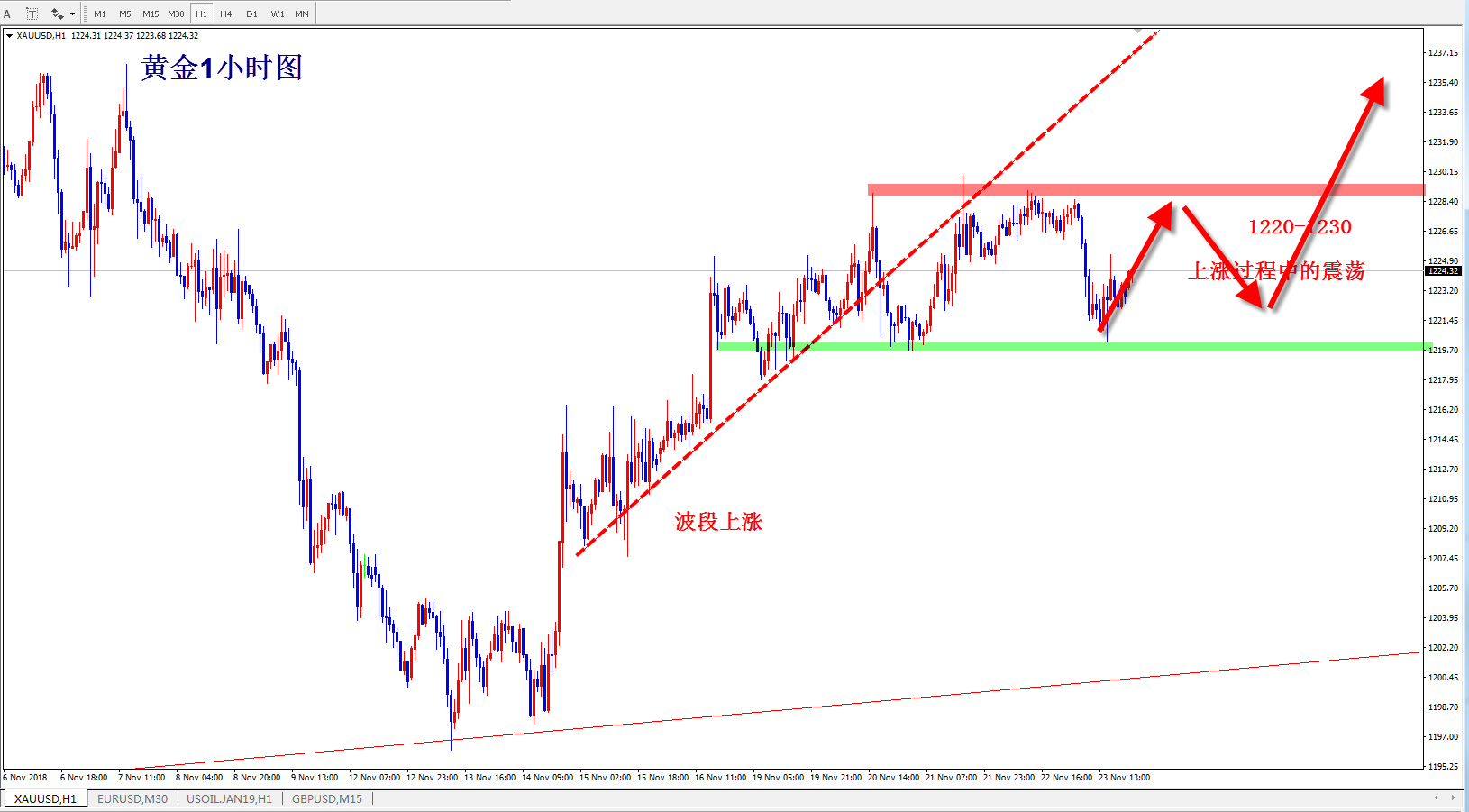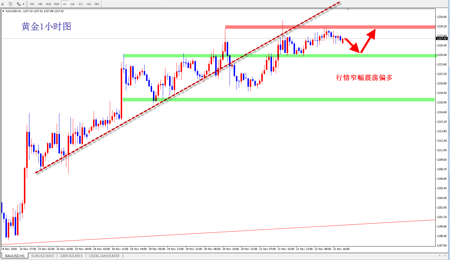 黄金 震荡上行格局不改,今日早盘黄金1227现价多,保护1222,目标1232;现报1227; 今日是感恩节假期第二天,相信昨天你也看到了,黄金由于缺少美国佬的参与,行情交投清淡,全天围绕3美金幅度进行波动, 今日预计黄金波动依然不会太大!但是黄金上行格局依然没有改变,当前属于短线震荡,震荡之后还会继续上!前期王杨就说过,黄金突破并站稳1220位置是开启波段反弹的开始,对于中线波段选手可以着手布局!但是日内短线选手还是高空低多! 黄金如预期在1220上方震荡,预计震荡格局会持续到下周初,随着美国通胀指数的降低,2019年加息的预期也在降低,美元指数上涨遇到瓶颈!黄金无论在技术上还是基本面都进