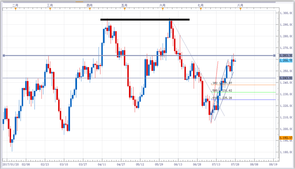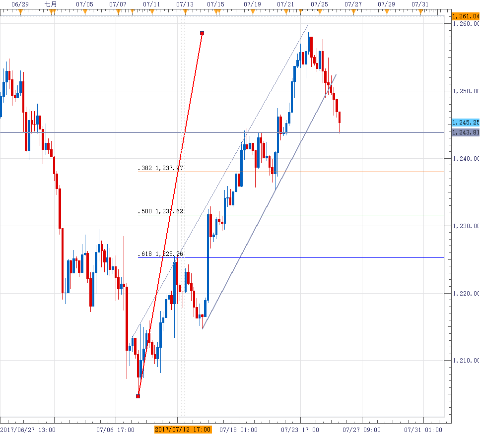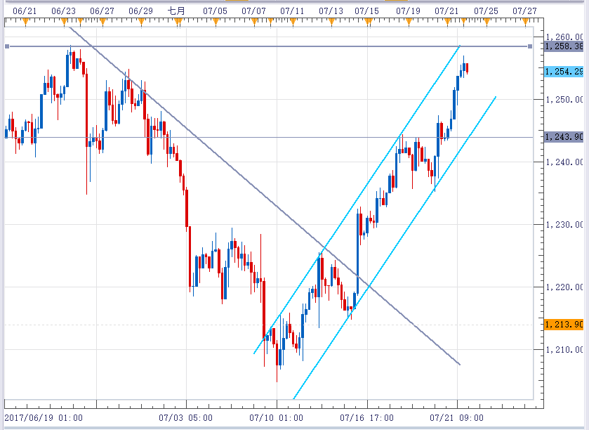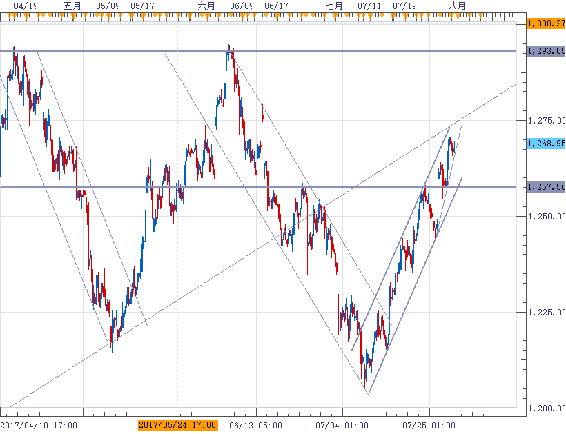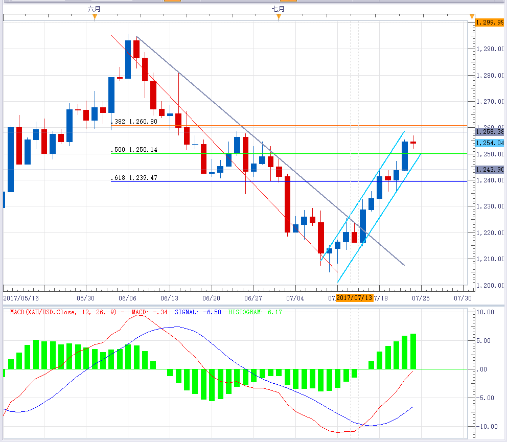 黄金技术面上行的趋势一直保持完好,市场热情高亢, 重心不断上移,回调都保持在支撑位之上, 宏观面美国经济数据数据好坏不一,周五二季度GDP差于预期, 以及朝鲜发射弹道导弹等地缘问题升温,再次引发避险买盘。 金价后市前景分析师观点不一,有些投行继续看涨,有些投行仍然唱空, 机构观点不一,说明多空仍在努力对峙,