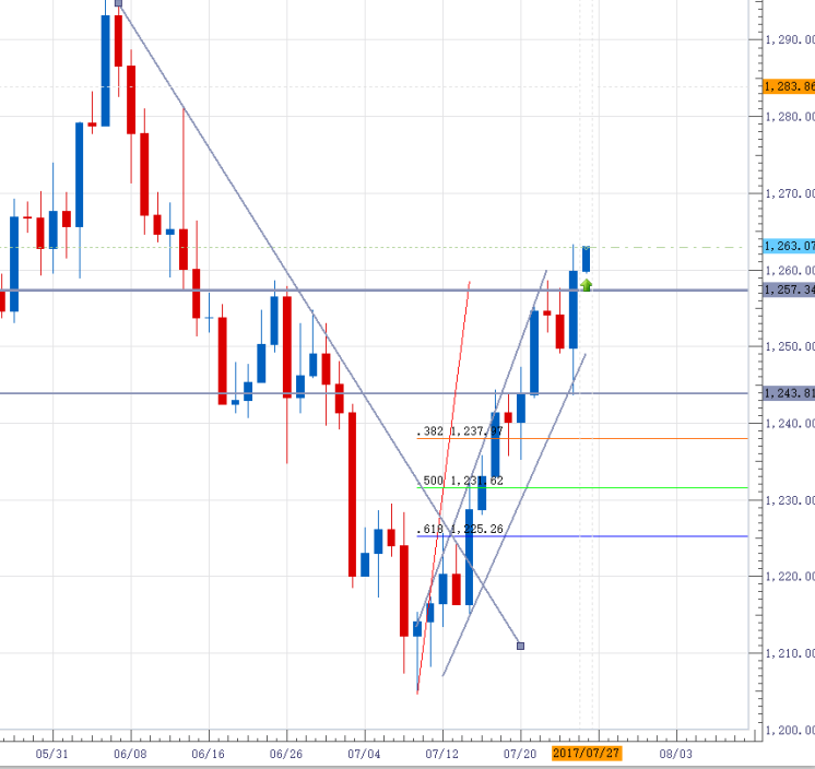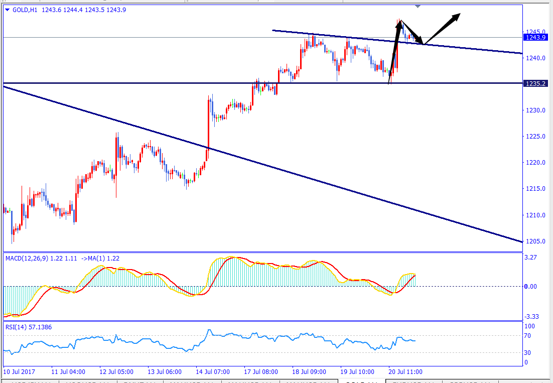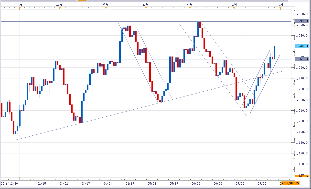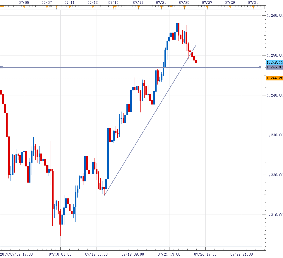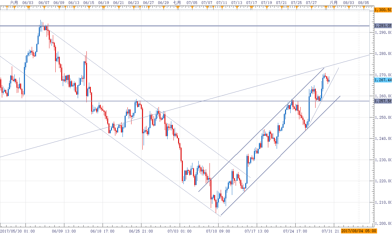 黄金技术面上行的趋势一直保持完好,市场热情高亢, 重心不断上移,回调都保持在支撑位之上, 宏观面美国经济数据数据好坏不一,周五二季度GDP差于预期, 以及朝鲜发射弹道导弹等地缘问题升温,再次引发避险买盘。 金价后市前景分析师观点不一,有些投行继续看涨,有些投行仍然唱空, 机构观点不一,说明多空仍在努力对峙,