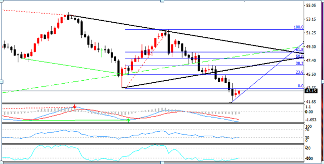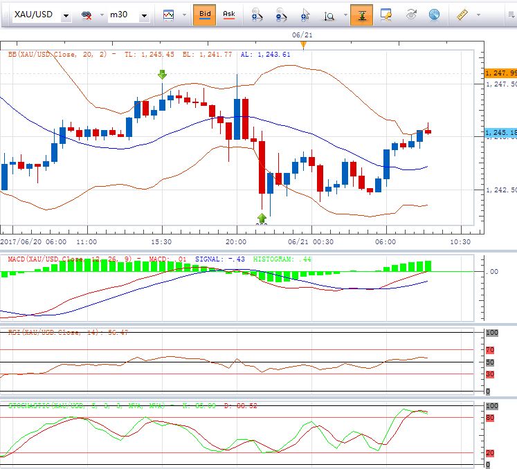 周三油价继续下挫,美元也走低。 美国长期债券收益率也跌至七个月来的最低点, 投资者认为油价下跌会降低通胀压力,使美联储不太可能继续实施加息。 这为黄金短线反弹提供潜在支撑。 技术面上,短线或完成最后一跌,1240或是这波下跌的低点, 黄金在突破1247高点后,短线或继续走高。 短线操作上, 黄金1240上逢低做多,看