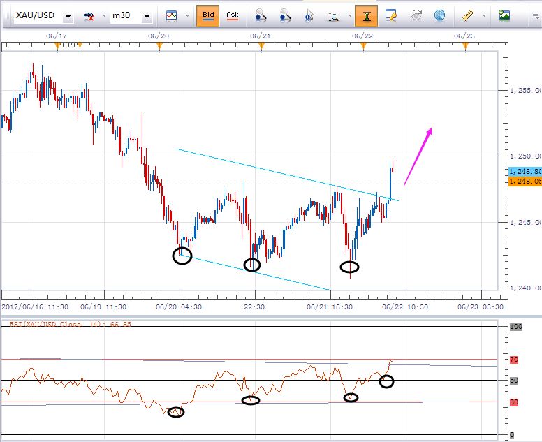 回想起隔夜1255关口迟迟不能突破, 黄金连续在高位震荡,且迟迟不见上涨,一大早就睡不着,想去办公室看行情。 打开电脑,黄金果然是震荡下行,给了投资者再次低多机会。 且隔夜1246上做多,1246的支撑判断十分到位。有效支撑起黄金反弹,现报1250. 股市疲软对黄金形成一个支撑的因素,在风险较高的市场如股票波动时,黄金