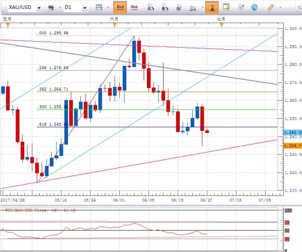 在美联储主席有影响力的官员发表鹰派讲话之后,美元继续坚挺,触及3周高位。 周二同为大宗商品的原油大幅下挫,纽约原油期货下跌至43美元/桶之下, 触及到了数月低位,对 黄金 也产生了一定的抛售压力。 技术面上,黄金跌破了100日均线1247,距离200日均线1237只有一步之遥。 接下来黄金多空将围绕200日牛熊均线展开激烈震