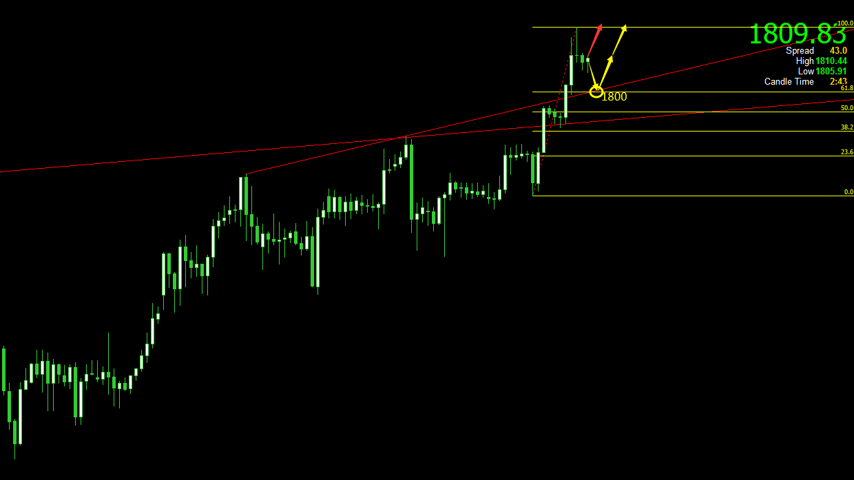 昨日行情回顾:周三黄金亚盘时段持续在1791-1796这5美金的窄幅区间内波动,欧盘开盘后强势拉升并一举突破1800散户及机构心理关口,美盘时段最低回撤至1800附近后开始二次拉升,最高触及上方1817.74美元/盎司,日内波幅达到25美金的空间,并且持续刷新2011年9月以来的新高,尾盘时段小幅震荡下行,收盘于1808.37,今日早间金价1806.91低开后小幅上冲随后回落,目前金价在1806.9附近运行. 昨日喊单回顾:亚盘时段我们给到1794.7空单多次尝试下探无果之后果断在1793附近小幅获利出局,欧盘开盘后4点金价确认上行至1795上方,我们顺势于1796附近介入多单后金价开始上行