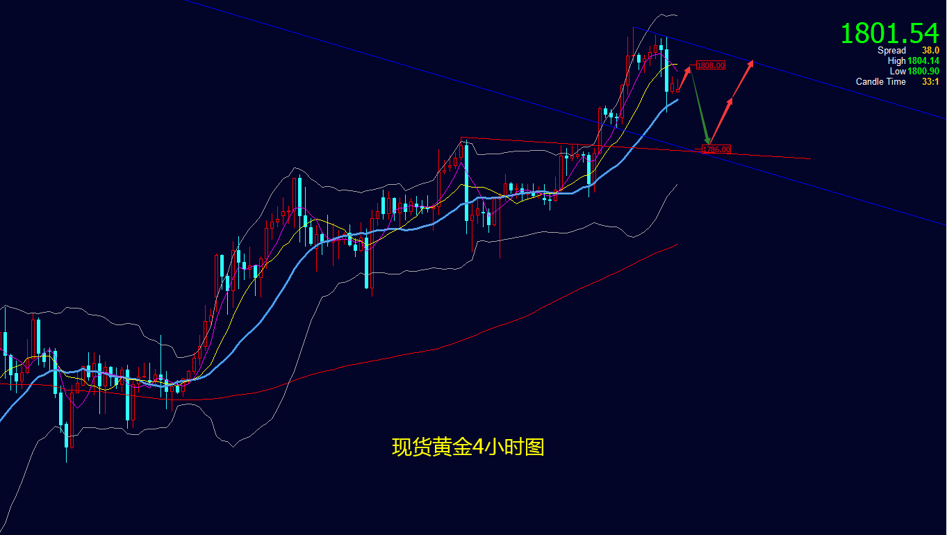 投资这座山,原本没有顶、没有头。不要站在旁边羡慕他人成功,其实成功一直都在你身边。只要你还有生命,还有能创造奇迹的双手,就没有理由当过客,更没有理由去抱怨失败。聪明的人,一味向前看,智慧人,事事向后看;聪明人,是战胜别人的人;智慧人,是战胜自己的人。修心要当以净心为要,投资要当用慧眼远眺。稳健投资之道,千万别想一夜暴富,积小胜为大胜,才是正确的投资心态。古人云:不积跬步无以至千里,千里之行始于足下,大海虽然浩瀚,也是有无数个小水滴组成的。 昨日晚间黄金多次尝试冲高无果后加之数据利空影响,金价跌破亚欧盘一直提供支撑的1805关键位置,随后一根阴线直接打到下方4小时支撑1795上方,日线最终以上