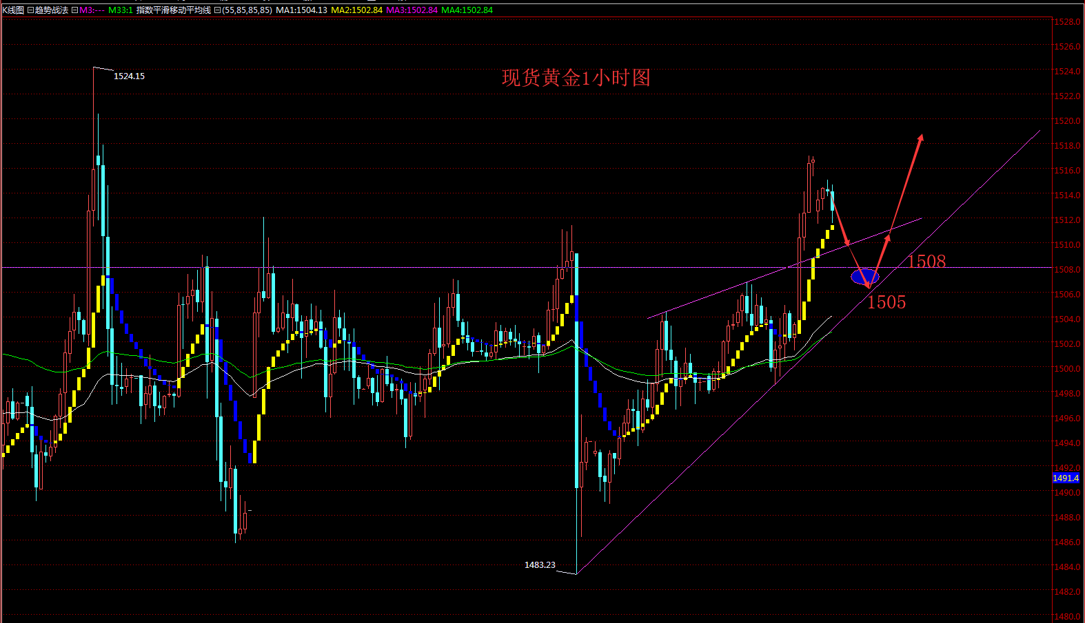 这个市场上亏损迷茫的投资者一抓一大把,没有一成不变的行情,也没有一成不变的投资者,我们需要的是不断的学习,不断根据行情来调整应对策略,市场是永不停息的,行情是不断变化的,虽然我们不能抓住每一波行情,但是有把握的我们抓住了即可,学会用可观冷静的态度来对待市场,降低交易频率。等待机会,这样才能守株待兔在最合适的位置进场,也只有这样才能把风险降到最低,把利润做到最大。 日内行情分析:日线级别MACD快慢线在0轴上方开始拐头,KDJ金叉持续发散当中,金价触上周五触及布林带中轨,5/10日均线金叉有效向上发散,技术指标逐渐修正偏多运行,5日均线在1505附近,10日均线在1500附近,布林带中轨在15