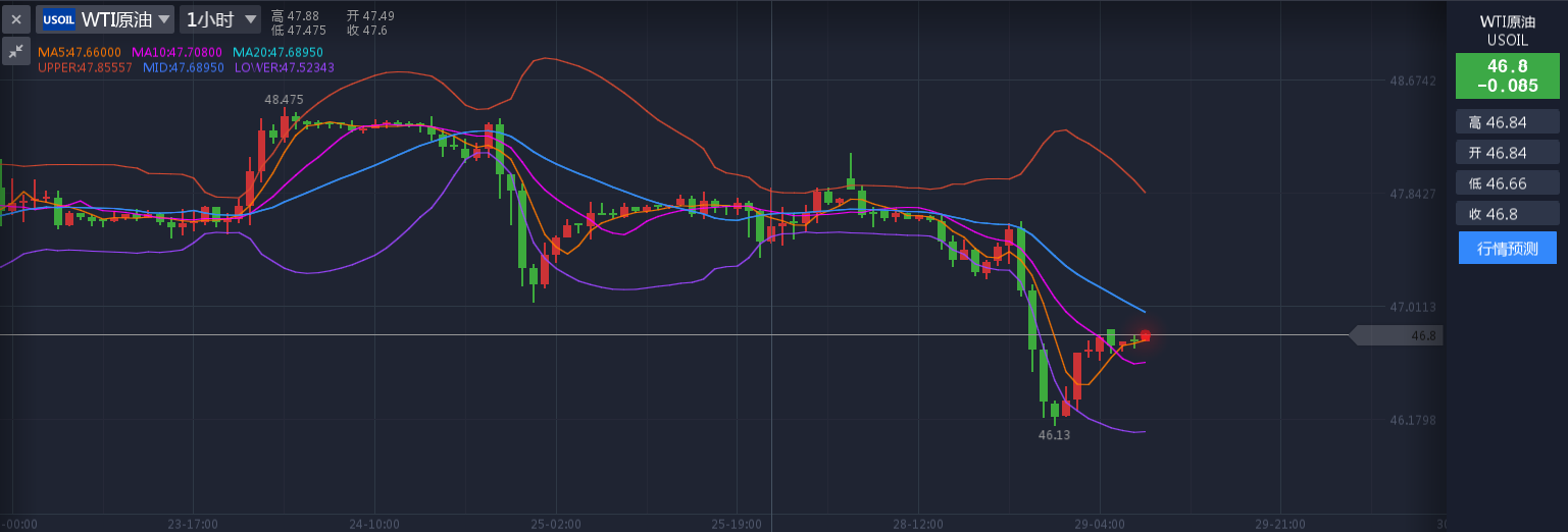 黄金方面 黄金昨日日内一直维持在1330-1334区间震荡,多次试探1335压制未果在晚间价格回落破1329一线后快速回落至1320附近陷入了震荡,晚间价格震荡在1320--1325区间,日线以阴柱收尾。我们昨日早间多单盈利未出出现扫损,而价格破位后我们果断1329进空获利。 当前日线布林带上轨开始放平而季度均线和中下轨下向上,因此