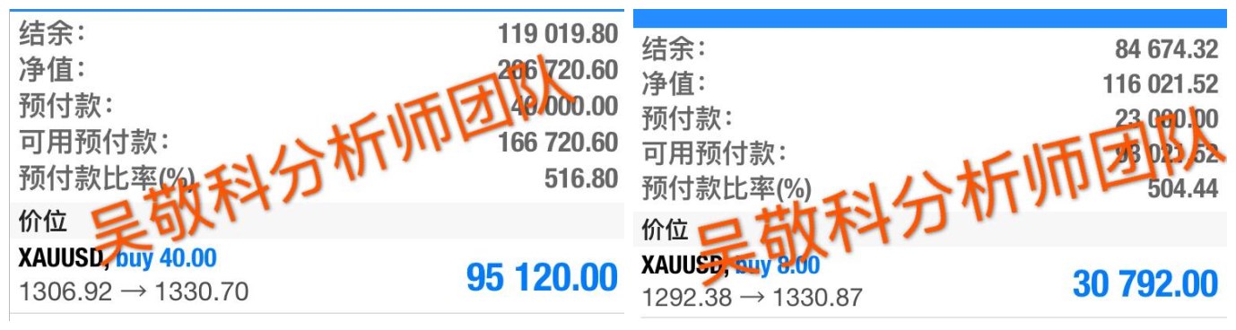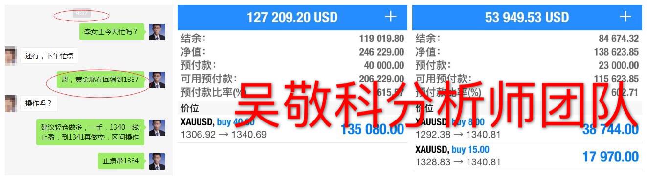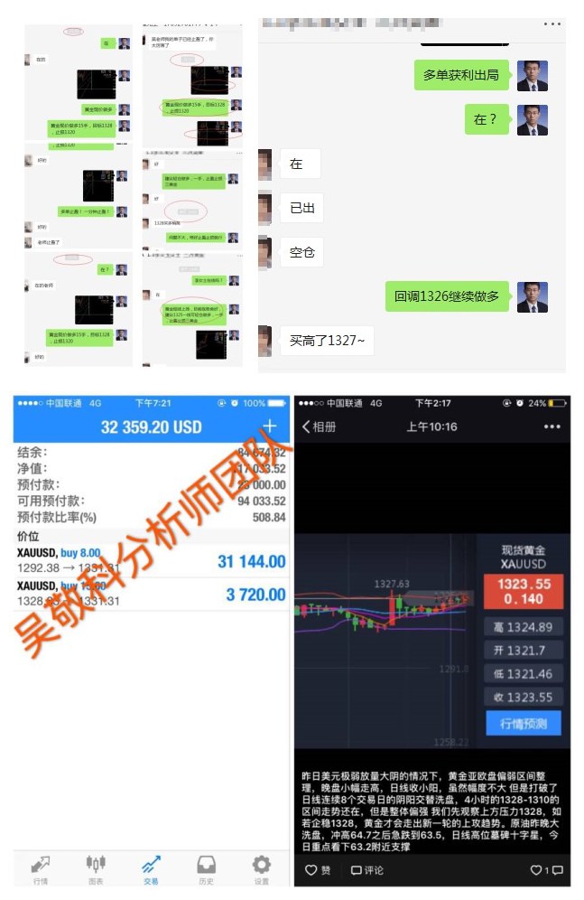周线收官,一路收割! 周五又是周线收官日,黄金在美盘开盘前一直是单边上涨的行情,吴老师在亚盘通知实仓在1325一线开始做多,一路止盈。朋友圈也强调过黄金一旦突破1328一线,黄金势必会迎来新一轮的上攻趋势,果不其然,直接上冲到1333一线,实仓客户短线也在企稳1328一线布局多单,成功到达止盈目标。美盘开盘伴随着恐怖