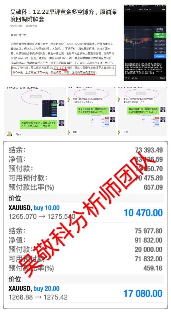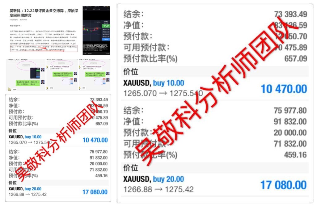 周五斩获近十多万,首先需要明确的思路 周五早间敬科的文章《吴敬科:12.22早评黄金多空博弈,原油深度回调附解套》不知道大家有关注没?下方破位1260低点支撑,而上方破位1270一线,那么高点将出现在1276-1278附近,那么今日操作上依旧下方重点关注1260一线,上方关注1270一线,破位顺势,不破,区间内高沽低渣即可。有了明