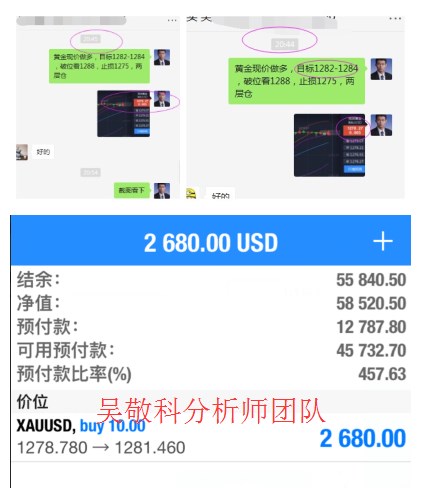 黄金连续两天的涨势,自昨天开始在1278一线布局的多单策略,获利点位在1282附近,获利4美金,今天的策略在1281开始布局多单,亚欧盘基本没回撤震荡反弹,欧盘出新高,而且非常靠近上方关键压力。美盘前预计先出回撤,所以我们今日早盘1281一线加仓多单提示1285-1286先离场。也获利5美金,海军回撤到1283一线,敬科果断通知实