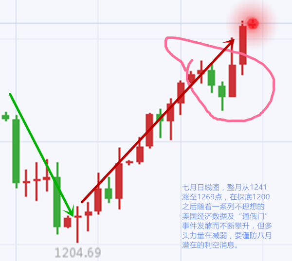 整个七月,黄金走出完美的V形形态,月中探底至1204,一度有跌破1200的声音出现,但市场还是顽强地撑了下来,受益于一系列利多的经济数据,以及地缘政治等等问题,导致避险情绪不断升温,黄金于上周末冲破1270并有所回落。 整个市场的情绪目前依然是偏多的,但一定注意接下来的超级周,有很多影响黄金的大事出现,这些都是做