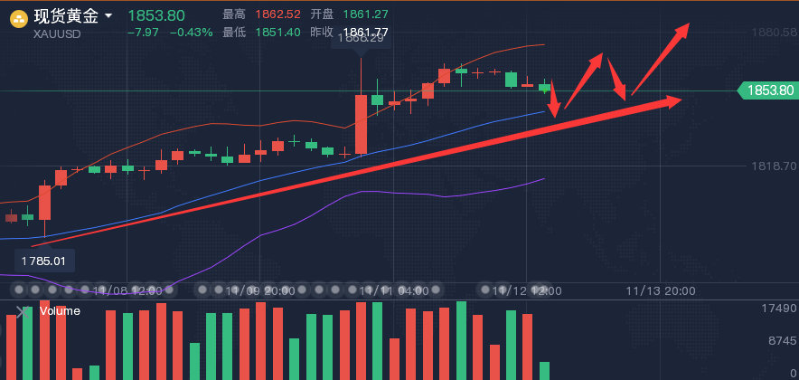 黄金行情分析: 周五(11月12日),现货黄金小幅下跌。周四(11月11日)金价迎六连阳,此前强劲的美国消费者物价指数(CPI)数据推动投资者争相买入被视为对冲通胀工具的黄金,股市人气的消退也支撑金价,但美元走强拖累金价涨势。周五亚欧盘小幅下跌目前交投于1850附近,给美盘上涨提供了相对较大的空间。 黄金从日线上来看,昨日再次收取中阳,金价连续6日收取阳线,整体的趋势还是偏涨,但是昨日冲高不破,让多头显得有点乏力,再加上亚盘的回落,所以短线调整的迹象已经很明显,下方支撑关注1845附近,预计调整后再次冲高, 四小时来看,金价在1865附近滞涨明显,如果多头形成极强上升格局,从昨晚尾盘来说是需