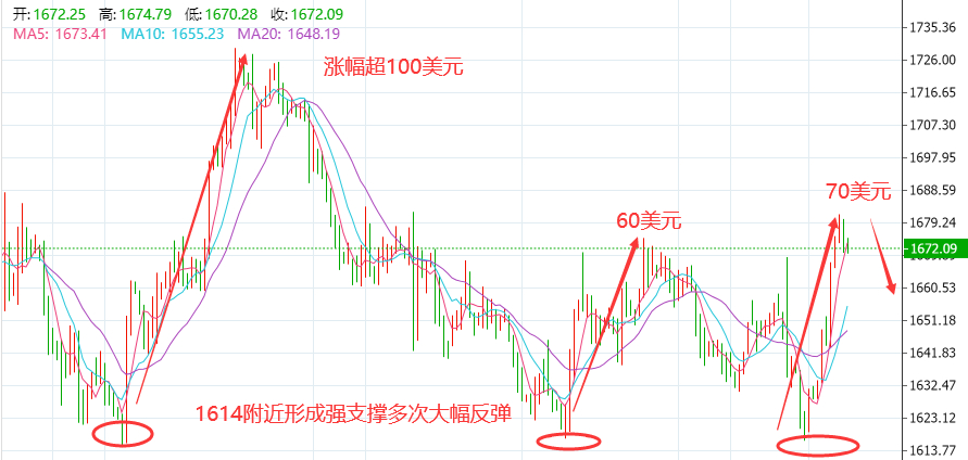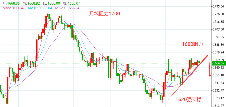 黄金与美国通胀加息的关系: 从历史走势看,黄金与美元实际利率呈现较强的负相关性。实际利率是名义利率减去通胀,因此黄金走势实际反馈的是,通胀与加息的节奏。”展大鹏表示,当市场预期通胀因素是影响行情的主要因素,则美联储加息是追赶通胀指标的,此时实际利率仍处于下行趋势,黄金则会延续上涨趋势;反之,当市场预期美联储加息能够有效抑制通胀上升势头之时,实际利率则呈现触底抬升走势,黄金则会处于触顶下行趋势,今年我们就处在这么一个阶段。 行情回顾: 国际黄金周三早盘回测1650关口后,日内开启多头上攻,欧盘加速,先后上破1660及1670关口,欧盘高点刷新至1674-75附近后短线回撤,美盘维持1660