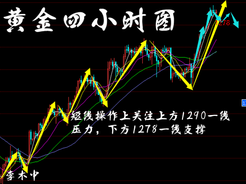 今天所做的一切,都是为明天的成功作准备。每天都是一个起点,每天都要有一点进步,每天都要有一点收获! 从日线来看,黄金日线四连阳,上涨趋势强劲,昨日下跌1281.37在次拉升1290高点,短线关注下方1280一线的支撑,上方关注前高1295附近一线阻力,也是关键的结构点位。 从近期的风险厌恶情绪,加上疲软的美元指数,将支撑