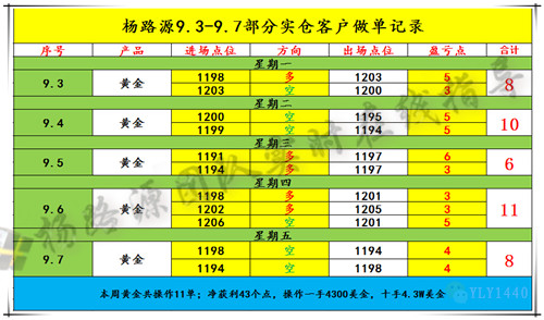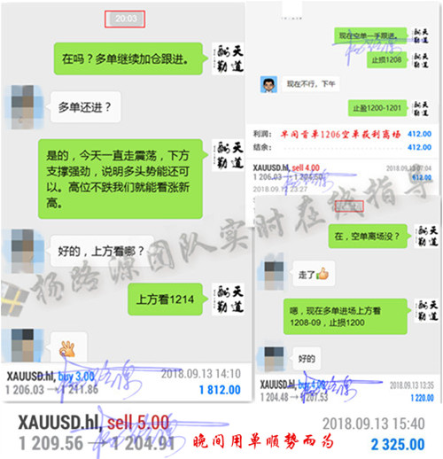 成功的秘诀:正确的资金管理、严格的心态控制、稳定的平台、过硬的技术实力、稳健获利的保证 没有一成不变的行情,只有一成不变的人,喜欢交易的人很多,但天天研究的人不多,拥有计划的人很多,但坚持执行的人不多,每个人的思想都很丰富,但正确的路却并不多。所以,有人赚钱,有人亏钱,有人笑,有人哭,关键看是否能走对路,跟对人。 周四黄金交易小结: 路源截至目前布局两单全部获利,早间我们按照策略在1206附近布局了空单,日内震荡行情,下跌波动不是很大,我们稳健操作直接在1204附近止盈出局。午间第二单在早间的空单获利出局后,1203一线迟迟不能破位,有明显的支撑现象。路源提示学员分别在1204.48及120