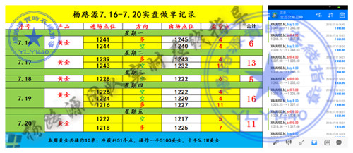 周末路源还是一如既往的坐在电脑前开始写黄金周评,你现在是在享受生活还是在为上周的行情而苦脑呢?都可以和路源一起来聊聊,可以像朋友一样聊聊生活,也可以像老师和学生一样为你解决你的投资困扰,或者聊聊行情。而本周想必又有不少朋友被套单所困,在这里还是希望大家别让生活的压力挤走了快乐,不管昨天发生了什么,不管昨天的自己有多难堪,有多无奈,有多苦涩,都过去了,不会再来,今天,我们要收拾心情,总结教训,重新出发!每一位在读这篇文章的人,路源感谢与你相遇!祝大家周末愉快! 7.16-7.20本周黄金交易获利51点,你跟上了没? 回顾本周交易,本周的行情还是很给力的;操作方面堪称完