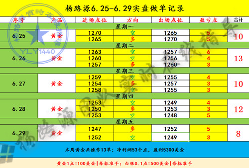 上午好!6月行情已经结束,7月行情也将从今日开始;2018年已经走过了一半,大家上半年的交易还顺利吗?收获怎么样呢?其实不管是盈利还是亏损,下半年其实才是大部分人收获的时候,下半年的成绩普遍要比上半年好!因此我们不用去纠结前面的亏损怎么样,任何时候都可以是一个新的开始!只要你在这个市场,只要你还在交易,所有的结果都会是一个变数,今天的你决定着未来的自己;你前期的盈亏,我不关心,我更加关心你的仓位,盈利了请继续!亏损了请总结!新一周,让我们一起再狙击这个市场的利润,这里的钱属于你我,只要你敢,就没有什么不可能。祝君好运,投资愉快! 杨路源:上周黄金(6.25-6.29)交易总结