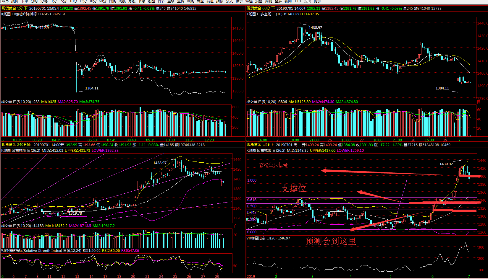 轰轰烈烈的降息炒作,结果昨天美联储纪要,根本没提降息的事情,寥寥几句,我在分析文章中多次提到这是利益集团在操作,就是所说的庄家在炒作。今天黄金1420了,最高点1439,我在我过去的文章说过影响黄金涨这波的主要原因,贸易壁垒让全球贸易不确定,中东波斯湾的地缘博弈,给和平增加了风险,因为川普的多变政策,让美国经济变的敏敢,一有风吹草动,加剧人们对美国经济和世界经济的担心,其中就业数据暴跌就给民间机构,和各大金融体炒作美国进入衰退的导火索,给了庄家操作的机会。现在问题是,中美G20的接头,和主要主持谈判的部门主管互通电话,这就是缓和的信号,美伊也出现对话信号,这样黄金多头真没动力了。 最少近