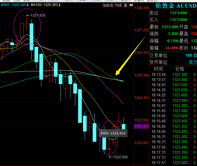 行情回顾: 今天的行情就不用多说了吧,从早间到下午,智铭一直坚持空头趋势,不破1325继续空,目标点位看1315--1310的策略。目前黄金的位置,是对该策略最好的解释了。 黄金晚间技术面剖析: 从小时图布林带来看,上轨上行,中下轨有下行趋势,MACD穿插下破0轴,绿色柱能开始放量。均线上,60日均线和120日均线同时走平,所