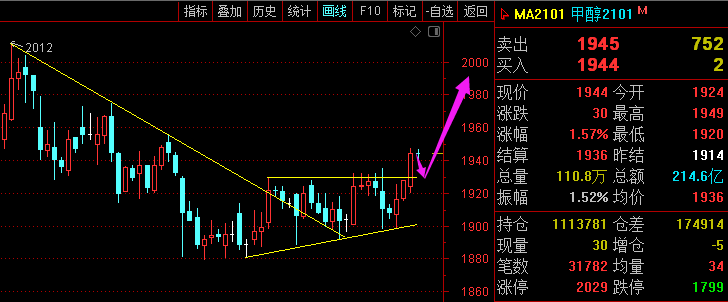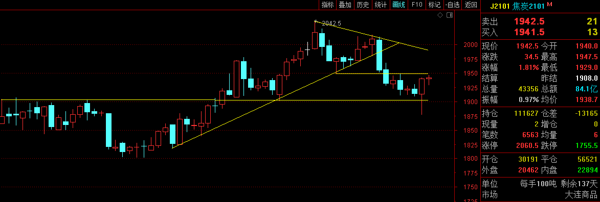 利剑无意:凌厉刚猛,无坚不摧,弱冠前以之与河朔群雄争锋。 软剑无常:三十岁前所用,误伤义士不祥,乃弃之深谷。 重剑无锋:大巧不工,四十岁前恃之横行天下。 木剑无滞:四十岁後,不滞於物,草木竹石均可为剑。 自此精修,渐进於无剑胜有剑之境。 愿以最简单的文字,作最精妙的行情分析。 焦炭2101—— 大周期来看焦炭的走势,图中两段基本一致,都是跌破趋势线之后,在关键支撑反弹,那么后续怎么走,就看是企稳于1950上方,还是跌破1900关口。不过,周线随着价格上升,MACD量能逐渐降低,转空的可能更大; 小周期四小时支撑1910-00区域,上方1954-55区域均线强压。 综合来看,焦炭暂时维持190