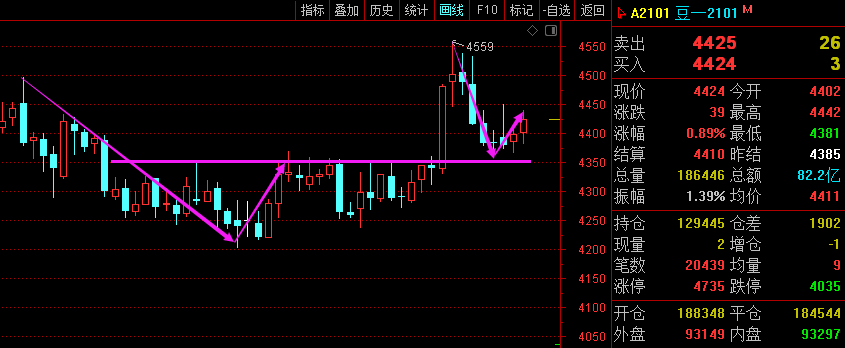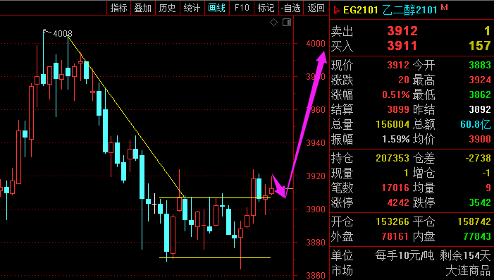 利剑无意:凌厉刚猛,无坚不摧,弱冠前以之与河朔群雄争锋。 软剑无常:三十岁前所用,误伤义士不祥,乃弃之深谷。 重剑无锋:大巧不工,四十岁前恃之横行天下。 木剑无滞:四十岁後,不滞於物,草木竹石均可为剑。 自此精修,渐进於无剑胜有剑之境。 愿以最简单的文字,作最精妙的行情分析。 豆一2101—— 大周期周线图绝对的多头趋势,日线图走势图中两段也有异曲同工之妙; 小周期小时图也是突破上周四形成的高点阻力,偏多走势。 综合来看,豆一依托4400附近支撑,有进一步上升的趋势。 乙二醇2101—— 大周期日线图大阳线突破阻力,而且收盘价就是最高价,有望直接飙升; 小周期四小时8月中旬的高点阻力在399