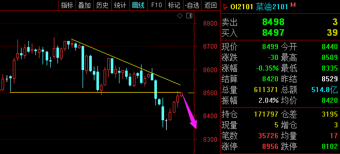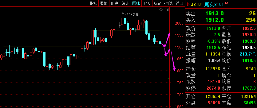 利剑无意:凌厉刚猛,无坚不摧,弱冠前以之与河朔群雄争锋。 软剑无常:三十岁前所用,误伤义士不祥,乃弃之深谷。 重剑无锋:大巧不工,四十岁前恃之横行天下。 木剑无滞:四十岁後,不滞於物,草木竹石均可为剑。 自此精修,渐进於无剑胜有剑之境。 愿以最简单的文字,作最精妙的行情分析。 棕榈2101—— 大周期日线图跌破20均线支撑,KDJ死叉向下发散,MACD空头动能放量,有进一步回落的趋势; 小周期如图所示,价格跌破近期强支撑5550一线,走势偏空。 综合来看,棕榈承压5550一线,有进一步回落的趋势。 焦炭2101—— 大周期日线图来看,价格跌破趋势线支撑,偏空走势,但目前价格面临1900整数关