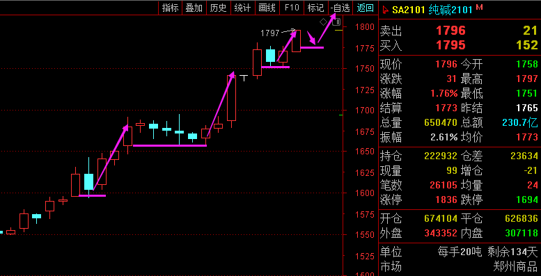 利剑无意:凌厉刚猛,无坚不摧,弱冠前以之与河朔群雄争锋。 软剑无常:三十岁前所用,误伤义士不祥,乃弃之深谷。 重剑无锋:大巧不工,四十岁前恃之横行天下。 木剑无滞:四十岁後,不滞於物,草木竹石均可为剑。 自此精修,渐进於无剑胜有剑之境。 愿以最简单的文字,作最精妙的行情分析。 棕榈2101—— 大周期日线图本周突破5800-16区域阻力,多头趋势; 小周期小时图周一突破之后一直受阻于5890附近,今天小时图也是突破5890附近阻力企稳于5900关口上方。 综合来看,棕榈依托5890-5900区域支撑,偏多走势。 纯碱2101—— 大周期强势多头走势,几乎没有回落; 小周期四小时每一波上升,都