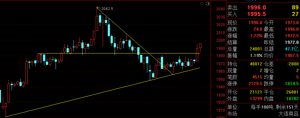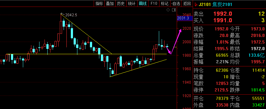 利剑无意:凌厉刚猛,无坚不摧,弱冠前以之与河朔群雄争锋。 软剑无常:三十岁前所用,误伤义士不祥,乃弃之深谷。 重剑无锋:大巧不工,四十岁前恃之横行天下。 木剑无滞:四十岁後,不滞於物,草木竹石均可为剑。 自此精修,渐进於无剑胜有剑之境。 愿以最简单的文字,作最精妙的行情分析。 焦炭2101—— 大周期多头趋势; 小周期也是突破近期阻力,偏多走势,但冲高回落上影线较长,后续将回撤支撑才能上涨。 综合来看,建议回落1980附近多,止损1962一线,目标2040一线,突破高点阻力可继续持有。 棕榈2101—— 大周期多头趋势; 小周期小时图突破上方阻力回落,略微偏多,但回落幅度较大有进一步回撤的趋