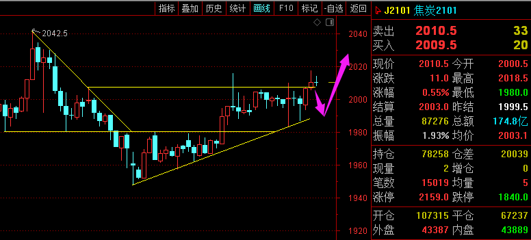 利剑无意:凌厉刚猛,无坚不摧,弱冠前以之与河朔群雄争锋。 软剑无常:三十岁前所用,误伤义士不祥,乃弃之深谷。 重剑无锋:大巧不工,四十岁前恃之横行天下。 木剑无滞:四十岁後,不滞於物,草木竹石均可为剑。 自此精修,渐进於无剑胜有剑之境。 愿以最简单的文字,作最精妙的行情分析。 菜油2101—— 大周期为多头趋势; 小周期如同前一波调整突破的走势一样,价格突破短线趋势线阻力,高点逐渐升高,如果后续能突破8809的高点,有望继续走出新高。 综合来看,建议回落8600附近多,止损8530下方,目标8809一线,突破可继续持有。 焦炭2101—— 大周期多头趋势; 小周期突破短线下行趋势线阻力,也突