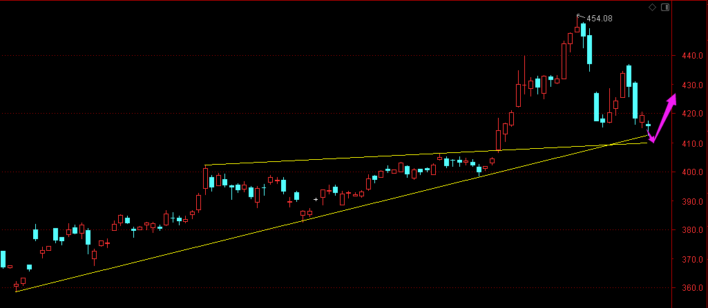 利剑无意:凌厉刚猛,无坚不摧,弱冠前以之与河朔群雄争锋。 软剑无常:三十岁前所用,误伤义士不祥,乃弃之深谷。 重剑无锋:大巧不工,四十岁前恃之横行天下。 木剑无滞:四十岁後,不滞於物,草木竹石均可为剑。 自此精修,渐进於无剑胜有剑之境。 愿以最简单的文字,作最精妙的行情分析。 沪金2012—— 大周期依然是多头趋势,虽然说近期回落比较多; 小周期日线图来看,之前突破三角形整理暴涨,目前价格回踩支撑线,同时也是60均线支撑所在,有反弹趋势。 综合来看,沪金依托下方410附近支撑先看反弹,上方初步阻力425-430区域,其次为437-440区域,而下方一旦跌破410附近支撑,将进一步打开下行空间