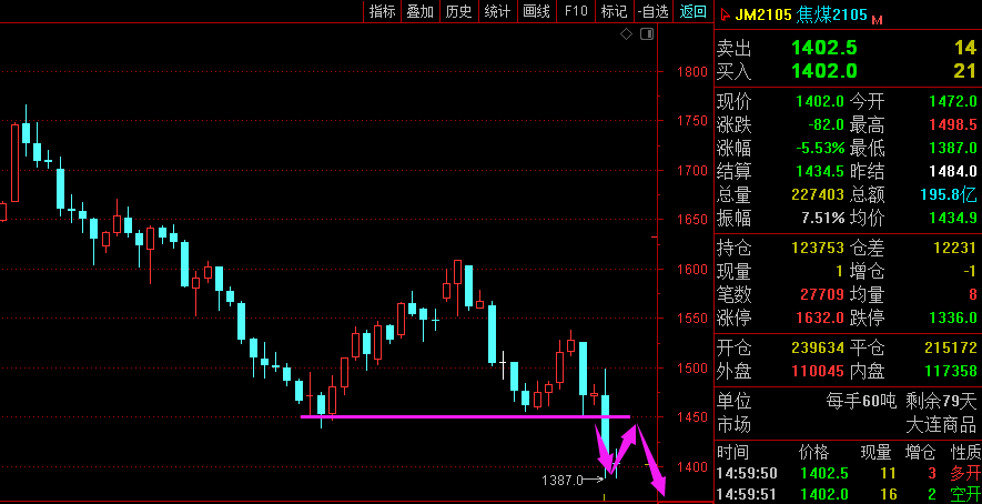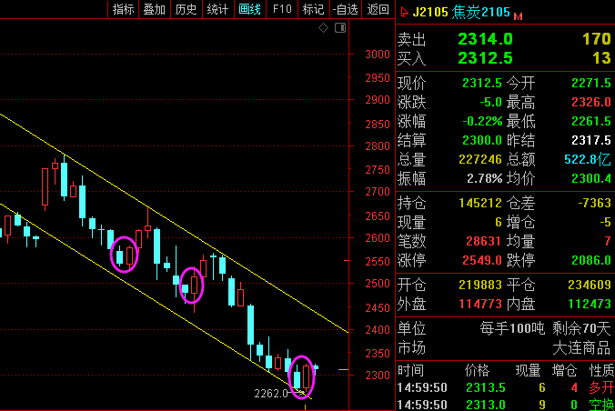 利剑无意:凌厉刚猛,无坚不摧,弱冠前以之与河朔群雄争锋。 软剑无常:三十岁前所用,误伤义士不祥,乃弃之深谷。 重剑无锋:大巧不工,四十岁前恃之横行天下。 木剑无滞:四十岁後,不滞於物,草木竹石均可为剑。 自此精修,渐进於无剑胜有剑之境。 愿以最简单的文字,作最精妙的行情分析。 焦炭2105—— 大周期日线图来看,目前的走势和2月初的走势一致,而且我们之前也分析61.8%回撤位置在2275附近,目前反弹企稳,后续将继续反弹; 小周期四小时昨天也是分析运行下行通道支撑位置,价格将反弹,但并未到2265-75区域,目前价格大涨突破2320-35区域,并且站上2350一线,偏多运行。 综合来看,焦炭