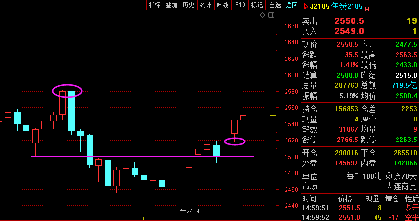 利剑无意:凌厉刚猛,无坚不摧,弱冠前以之与河朔群雄争锋。 软剑无常:三十岁前所用,误伤义士不祥,乃弃之深谷。 重剑无锋:大巧不工,四十岁前恃之横行天下。 木剑无滞:四十岁後,不滞於物,草木竹石均可为剑。 自此精修,渐进於无剑胜有剑之境。 愿以最简单的文字,作最精妙的行情分析。 焦炭2105—— 大周期日线图收看涨形态,有继续反弹的趋势,初步阻力20均线目前所在2584附近; 小周期来看,此前以2500为支撑,跌破之后才进一步走低,今天反弹企稳在2500上方之后,以此为支撑才大幅反弹,上方初步阻力2580附近,这是前一波反弹的高点,同时小时图120均线也在2586附近形成压制。 综合来看,昨天