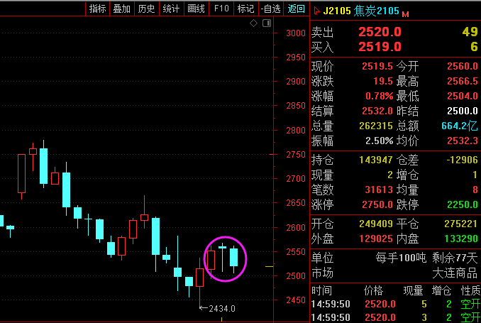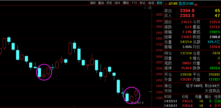 利剑无意:凌厉刚猛,无坚不摧,弱冠前以之与河朔群雄争锋。 软剑无常:三十岁前所用,误伤义士不祥,乃弃之深谷。 重剑无锋:大巧不工,四十岁前恃之横行天下。 木剑无滞:四十岁後,不滞於物,草木竹石均可为剑。 自此精修,渐进於无剑胜有剑之境。 愿以最简单的文字,作最精妙的行情分析。 焦炭2105—— 大周期日线图来看,虽然昨天底部收看涨形态,但今天价格承压于20均线回落收阴,整体走势依然偏空; 小周期四小时来看,MACD空头状态,冲高回落呈黄昏之星看空形态。 综合来看,焦炭承压于2540-50区域短线偏空走势。 焦煤2105—— 大周期日线图来看,两连阳反弹,企稳于120均线上方,而且突破20均线